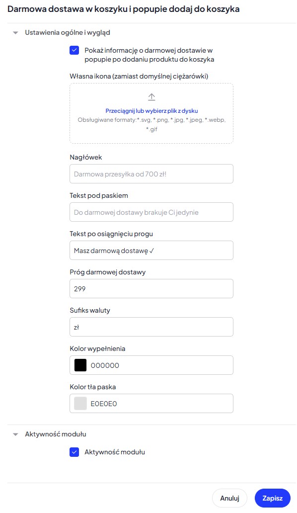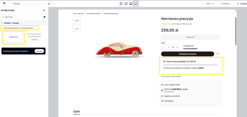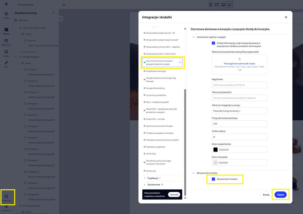 Przejdź do edycji szablonu, wejdź do zakładki „Integracje” > „Z aplikacji„. Tam odnajdziesz moduł o nazwie „Darmowa dostawa w koszyku i popupie dodaj do koszyka„.