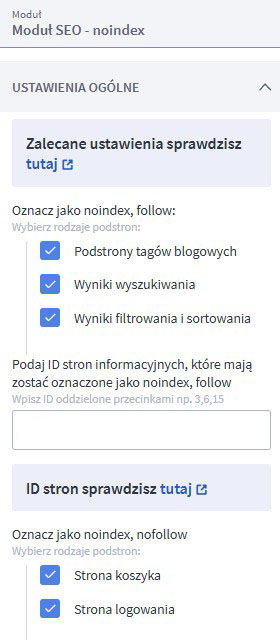 Zalecamy zaznaczenie wszystkich dostępnych opcji i podanie ID stron informacyjnych, które nie mają znaczenia dla pozycjonowania.