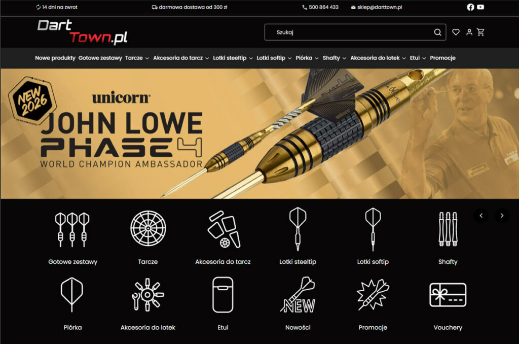 To sklep tworzony przez osoby, które żyją dartem na co dzień – grają, organizują zawody, wspierają zawodników i aktywnie budują środowisko wokół tej dyscypliny. Ten kontekst czuć w komunikacji i grafice: DartTown nie sprzedaje tylko sprzętu, ale zaprasza do świata, w którym początkujący są wprowadzani w pasję krok po kroku, a zaawansowani gracze dostają realne, fachowe wsparcie. Design nie dominuje – jest tłem dla autentycznej relacji między marką a społecznością.