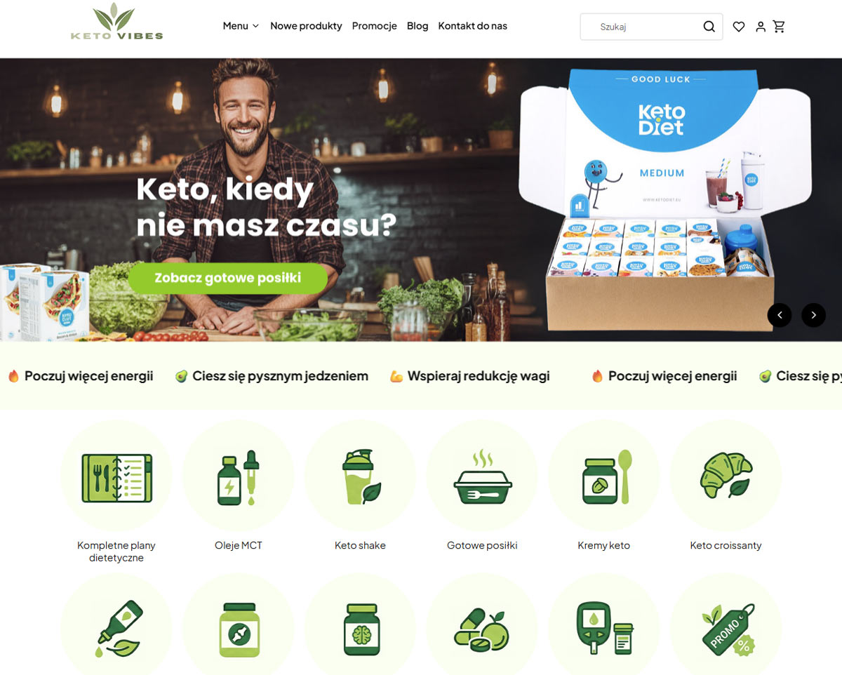 Kolorystyka, kontrasty i rytm strony budują energetyczny charakter marki, a grafika pełni funkcję informacyjną – tłumaczy, podpowiada i ułatwia decyzje zakupowe. Całość tworzy spójną, czytelną przestrzeń, w której użytkownik jest prowadzony krok po kroku, zamiast zostawać sam z trudnym tematem keto.