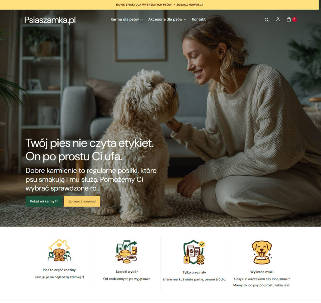 PsiaSzamka.pl to sklep, w którym design od początku podporządkowany jest relacji między człowiekiem a psem. Projekt oparto na szablonie Sentia, który dzięki swojej spokojnej, neutralnej formie pozwala wybrzmieć emocjom zamiast dominować nad treścią. Kluczową rolę odgrywają tu zdjęcia lifestyle’owe pokazujące codzienne momenty z psem – karmienie, zabawę, wspólny odpoczynek – które budują ciepły, domowy klimat i od razu komunikują troskę o pupila.